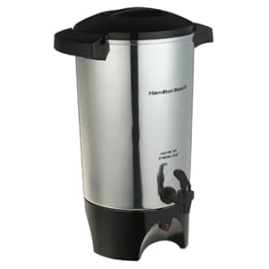 Ideal for buffet-style entertaining at home or as a self-serve option at a large business meeting, this coffee urn brews and holds between 12 and 42 cups of coffee. Designed to serve crowds, the polished aluminum urn brews about a cup of coffee per minute and has a ready-to-serve light that lets you know when you can start pouring. The two-way dispenser depresses to fill a single cup or can be propped in the vertical position to fill a larger carafe. Water level markings inside the urn help you accurately fill the urn to the proper water level. For safety, this coffee urn has heat-resistant handles and a locking lid for easier carrying without spillage. Other convenient features include a dishwasher-safe lid and brew basket and a detachable cord for easy storage. Hamilton Beach provides a 2-year limited warranty on this appliance. --Cristina Vaamonde