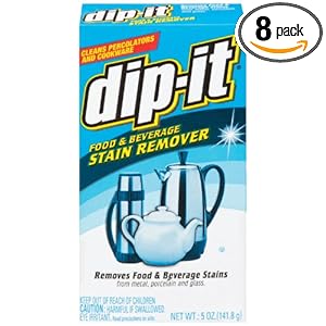 DIP-IT Food and Beverage Stain Remover removes food and beverage stains from metal, porcelain and glass. Use it to remove the oils that build up in your coffee percolator from the coffee beans or remove tea stains from your tea pot. DIP-IT Food and Beverage Stain Remover can also remove beverage stains from thermos or coffee mugs.
